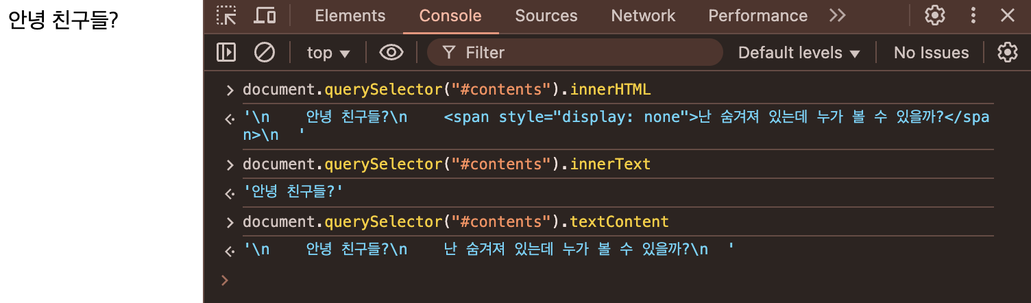 textContent: HTML 태그를 무시하고 순수 텍스트에만 접근
