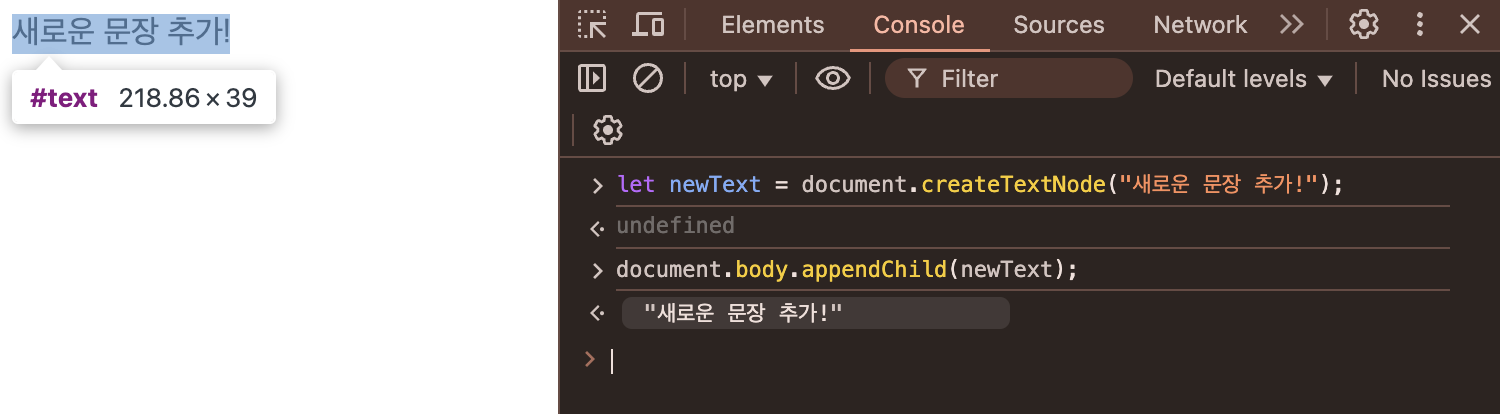 개발자 도구로 살펴 봤을 때, createTextNode()는 기존의 html 구조가 변하며, 아예 독립적인 노드가 생기는 것을 확인 가능하다.