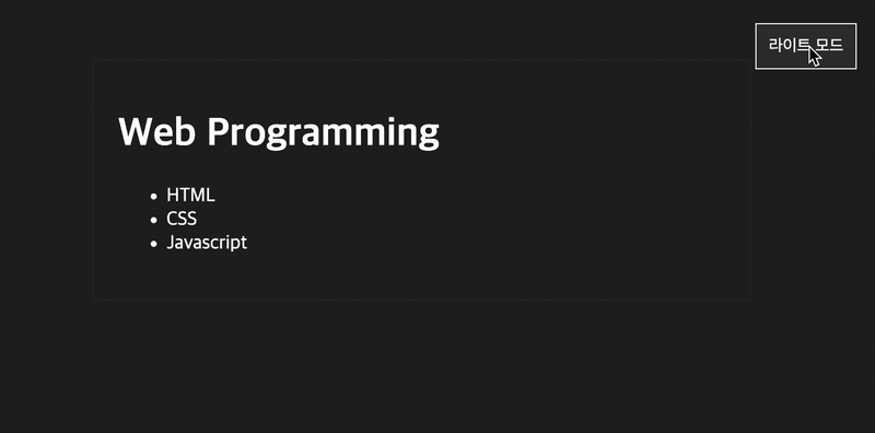 위의 코드를 통해 아래와 같이 동적으로 라이트/다크 모드를 토글할 수 있는 간단한 UI를 완성할 수 있었다.