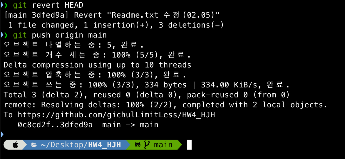 git revert를 실행하면, 자동으로 되돌리는 커밋 메시지를 입력하는 창이 뜨고, 기본 메시지를 그대로 두거나, 바꾸고 싶으면 커밋 메시지를 변경하고 저장하면 된다!
