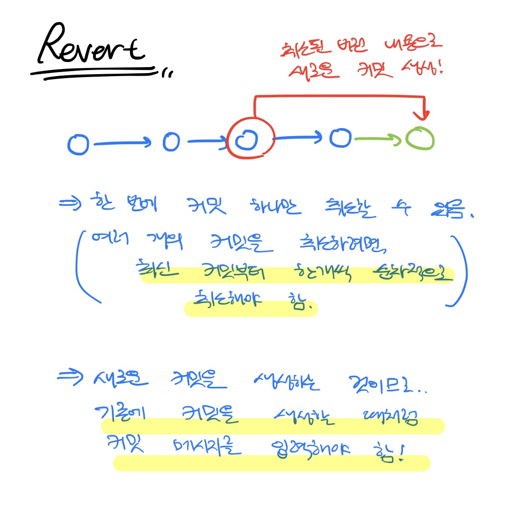 git revert는 git reset과 달리, 이미 원격 저장소(GitHub 등)에 푸시된 커밋을 취소할 때 유용하게 사용할 수 있는 명령어이다. 신기방기한 것이.. reset과 달리 기존 커밋을 삭제하지 않고, 커밋을 이번 버전으로 되돌리고, 그에 대해 새로운 커밋을 만들게 된다! 커밋을 새로 만드니까.. 협업할 때 훨씬 안전한 방법이겠지?!🙂↕️ 깃허브에 푸시할 때도 이것이 훨씬 문제가 덜할 것이다..